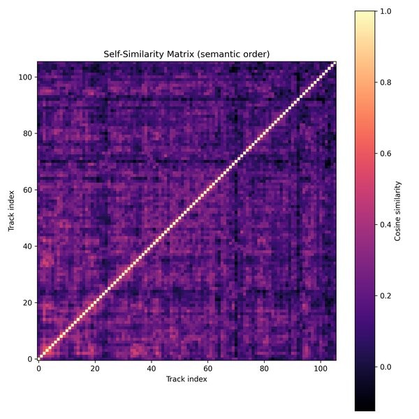 I’ve been experimenting with Self-Similarity Matrices (SSMs) to explore structural patterns in music. SSMs are a visualization technique where each point in the matrix represents the similarity between two segments of a song, typically using spectral features like mel-frequency content. By overlaying this with a matrix derived from lyrics or spoken features (e.g., repeated words or syllables), it's possible to get a multi-layered view of how songs are structured — musically and linguistically.