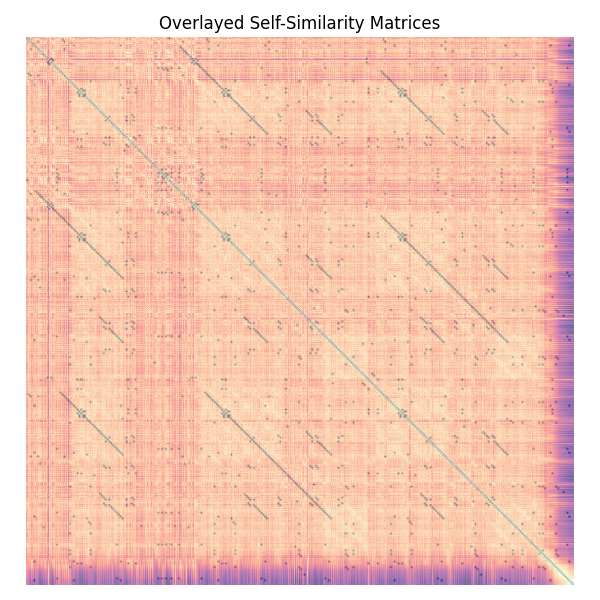 I’ve been experimenting with Self-Similarity Matrices (SSMs) to explore structural patterns in music. SSMs are a visualization technique where each point in the matrix represents the similarity between two segments of a song, typically using spectral features like mel-frequency content. By overlaying this with a matrix derived from lyrics or spoken features (e.g., repeated words or syllables), it's possible to get a multi-layered view of how songs are structured — musically and linguistically.
